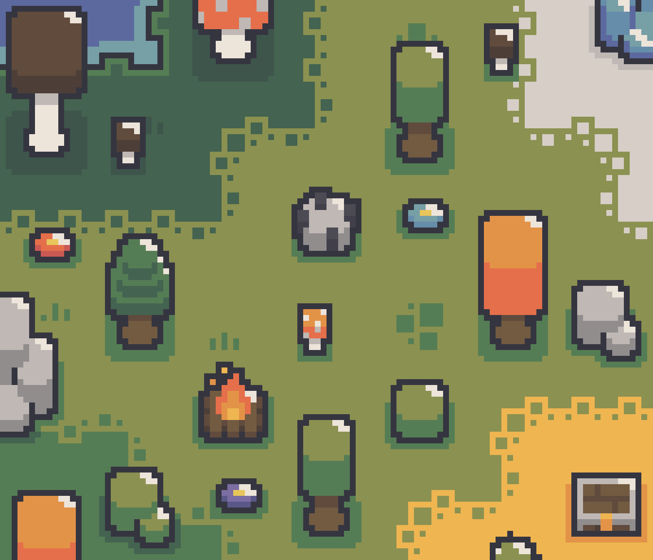 I actually think the assets look amazing only point where it gets a little annoying is the resources and the duplicates. Since the shadows/biomes are built in I can't use the resources on non biome tiles, plus there are a lot of tiles that are simply duplicates with other shadows. (The resources, walls, fences, fountains, bridge probably a lot more). I am working with Godot and since it is really easy to make another layer i would not need all the biome bridges since i could put the bridge on a layer on top of the ground (only if there is no biome background otherwise it looks odd) . If you have created Assets on different layers it should be pretty easy to create the things without the biome background or shadow. Sadly removing the things from pngs is really time consuming and annoying. I made the worst looking stone with, the worst looking alpha shadow as a sample i could use that stone on taiga ground since the yellow is not in the png.
